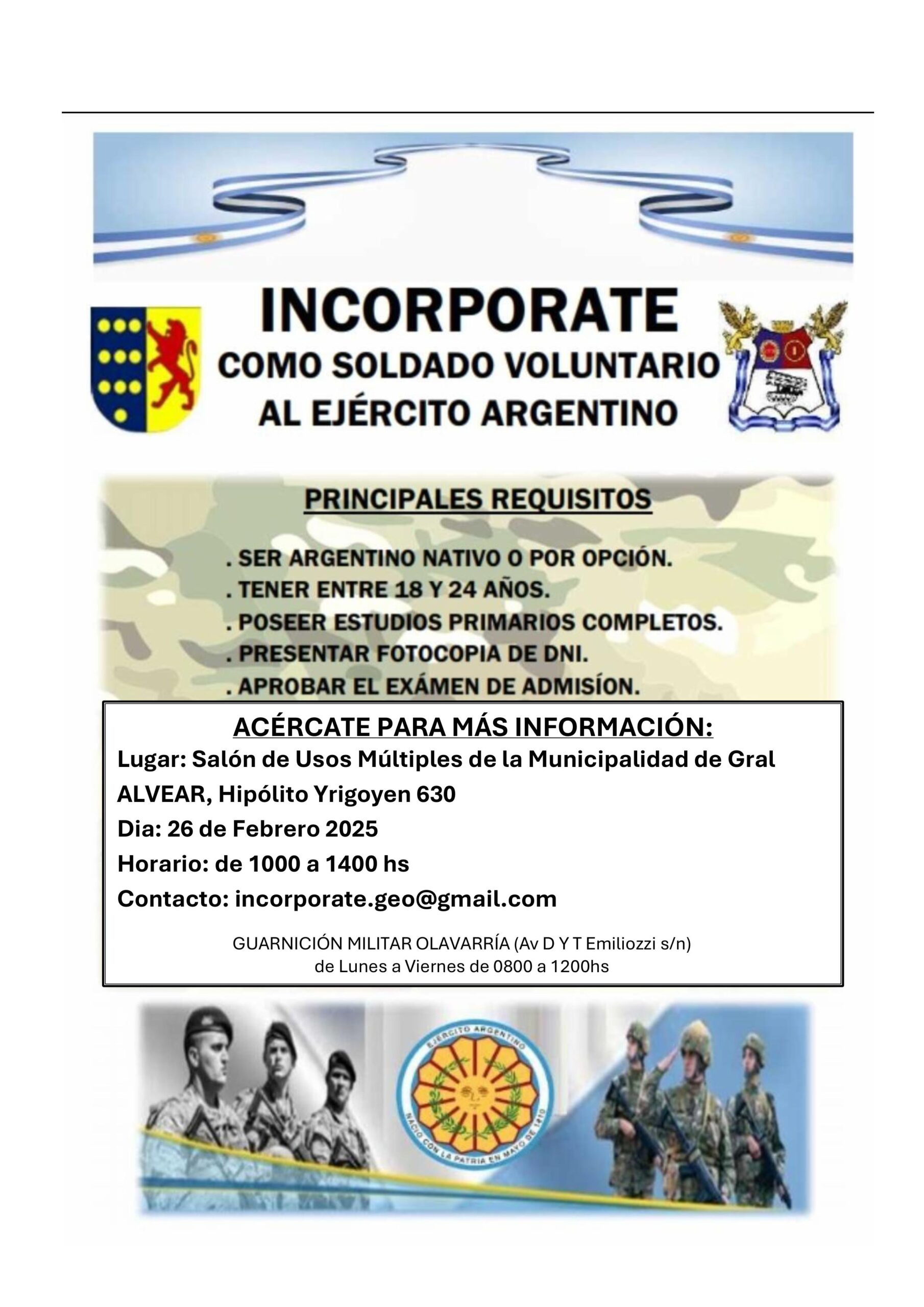 La Municipalidad de General invita a los vecinos a concurrir a la charla informativa de incorporación al Ejército Argentino que se llevara a cabo el día miércoles 26 de febrero, en el horario de 10:00 a 14:00 horas.